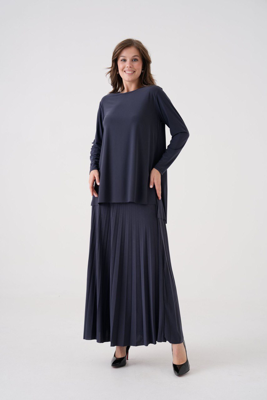 Zarafeti ve konforu aynı anda sunan bu sandy kumaş etekli takım, günlük şıklıktan özel gün stiline kadar her ana uyum sağlayan modern bir tasarıma sahiptir. Akıcı dökümlü üst parça ve tam dairesel pliseli etek uyumuyla bütünsel, elegan bir siluet oluşturur.