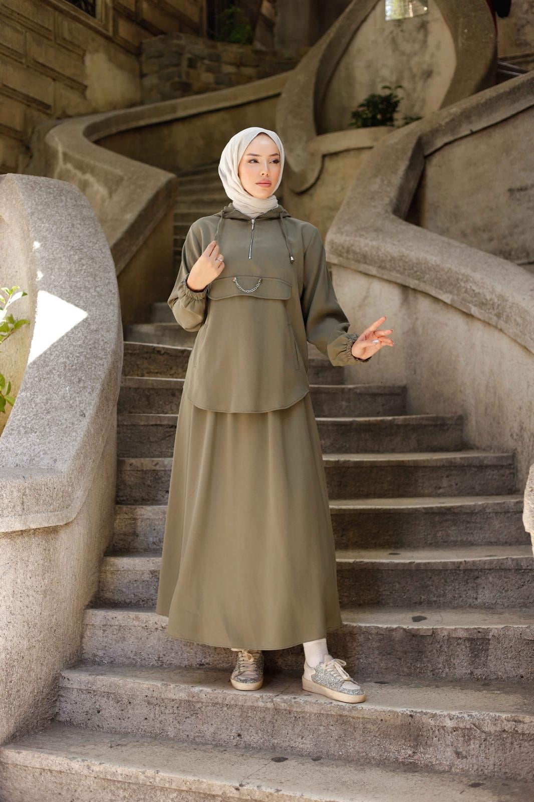 Haki Tensel Kapüşonlu Etekli Takım