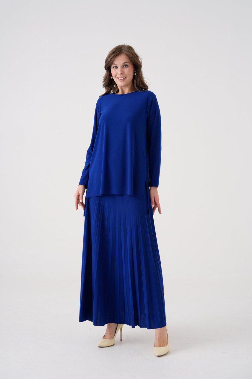 Zarafeti ve konforu aynı anda sunan bu sandy kumaş etekli takım, günlük şıklıktan özel gün stiline kadar her ana uyum sağlayan modern bir tasarıma sahiptir. Akıcı dökümlü üst parça ve tam dairesel pliseli etek uyumuyla bütünsel, elegan bir siluet oluşturur.
