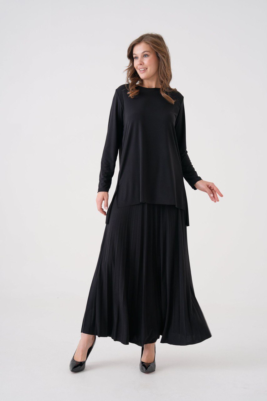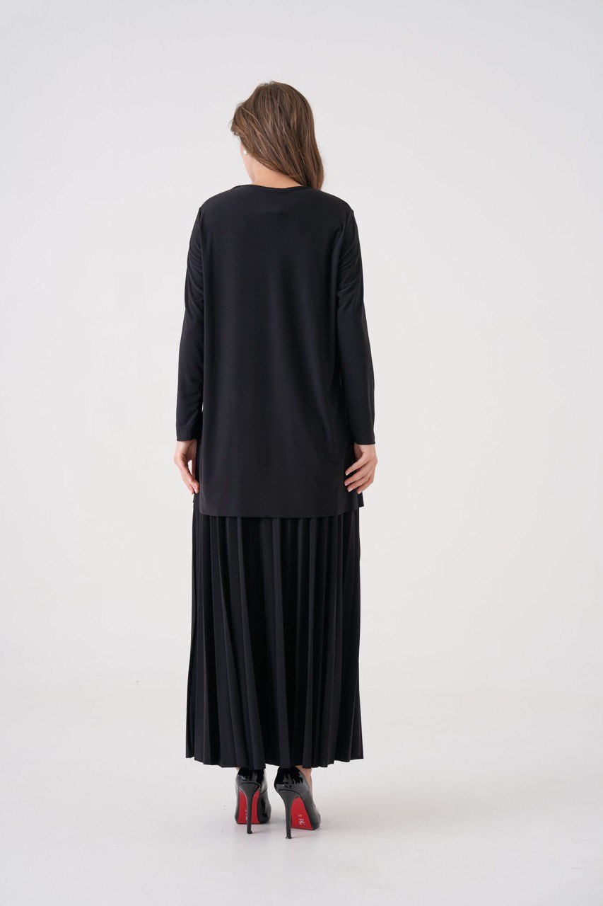 Zarafeti ve konforu aynı anda sunan bu sandy kumaş etekli takım, günlük şıklıktan özel gün stiline kadar her ana uyum sağlayan modern bir tasarıma sahiptir. Akıcı dökümlü üst parça ve tam dairesel pliseli etek uyumuyla bütünsel, elegan bir siluet oluşturur.